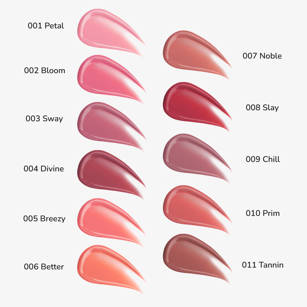A sheer, dewy vegan gloss that melts onto lips like ice in sunlight—delivering a glassy glow, ultra-moisture, and a translucent wash of evolving color that feels as effortless as it looks.